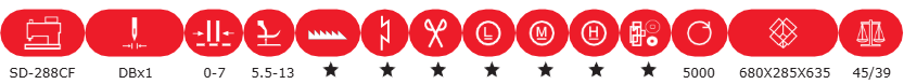 Adotando um inovador design de motor, com baixo custo de manutenção, design científico, adequado para quaisquer tipos de tecidos (leves a pesados); cárter blindado, diminuindo o risco de razamento; levantamento de calcador eletrônico, costura fácil e suave; ventoinha de grande volume de vento, dissipando o calor da caixa de controle; interface USB.