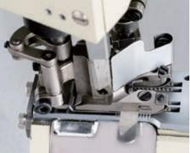 Flatseammer com motor direct drive, 4 agulhas, trançador superior, duplo corte de excesso de tecido, sistema pneumático para sucção dos excessos, ideal para costuras tubulares, fundo de cueca, roupas esportivas, etc, guilhtina (opcional) para corte de correntinha no início e no final através de sensor ótico, posicionador de agulha e calcador.